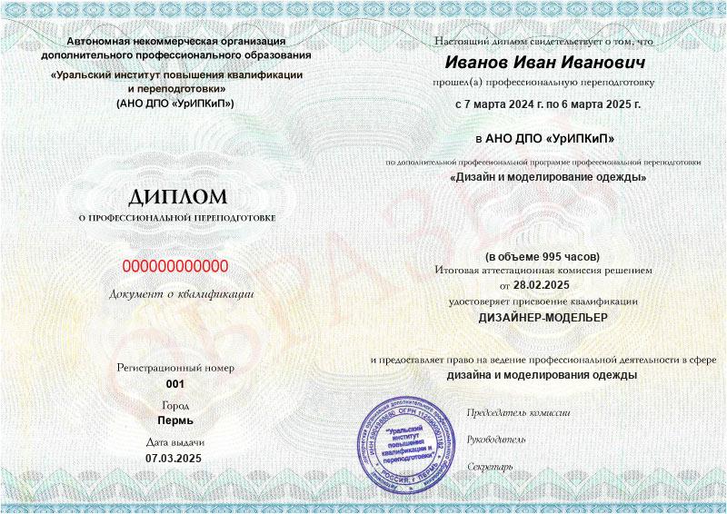 - Московский диплом о профессиональной переподготовке установленного образца с присвоением квалификации «Дизайнер-модельер».