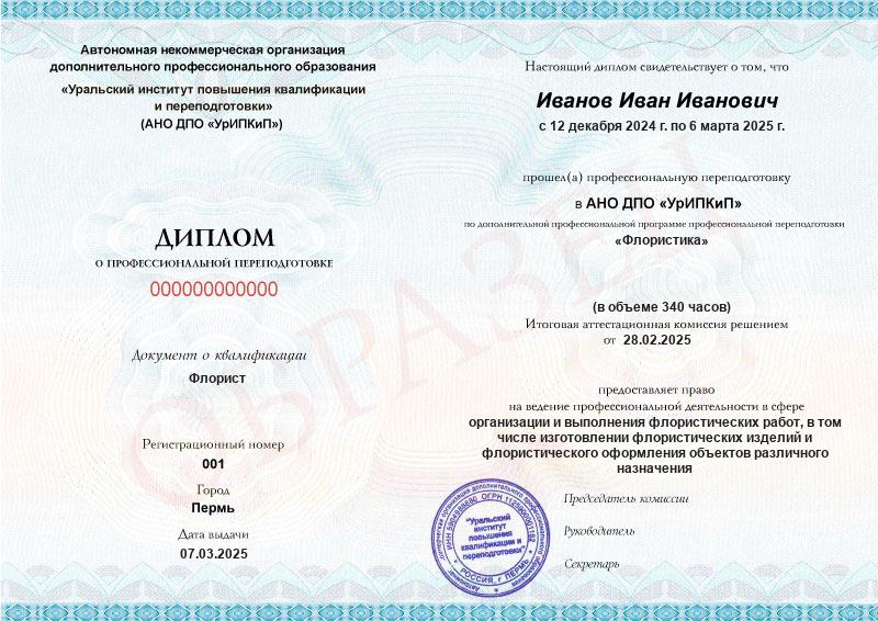 - Диплом о профессиональной переподготовке с присвоением квалификации «Флорист» или свидетельство о прохождении обучения.