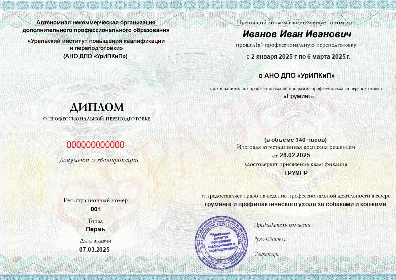 • Диплом о профессиональной переподготовке или сертификат о прохождении дополнительной образовательной программы «Грумер».