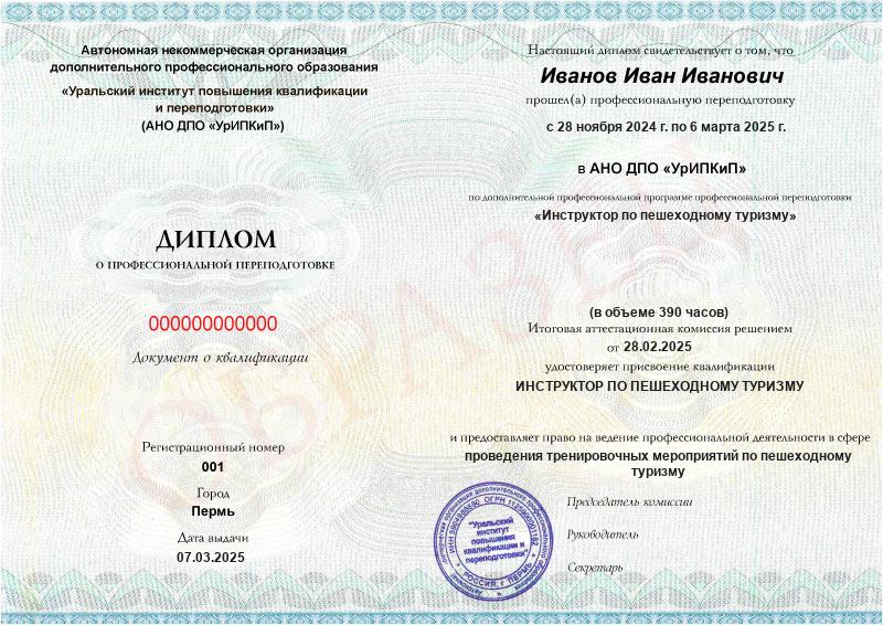 - Квалификация: Инструктор по пешеходному туризму