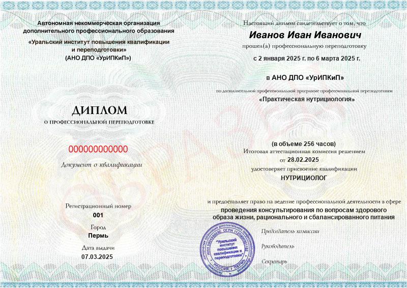 Да, дипломы и удостоверения оформляются в соответствии с действующим законодательством РФ. Документы печатаются на специальных бланках, заверяются печатью АНО ДПО «УрИПКиП».