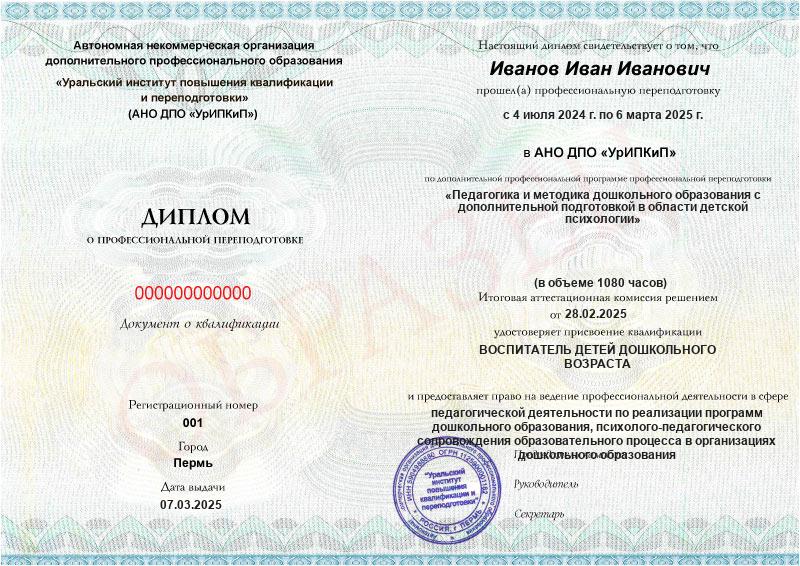 - Образец диплома о профессиональной переподготовке.