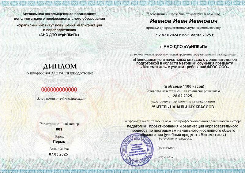 Преподавание в начальных классах с дополнительной подготовкой в области методики обучения предмету «Математика» с учетом требований ФГОС ООО (1100ч)