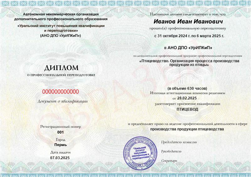 • Диплом о профессиональной переподготовке с присвоением квалификации «Птицевод». Вносится в Федеральный реестр документов об образовании.
