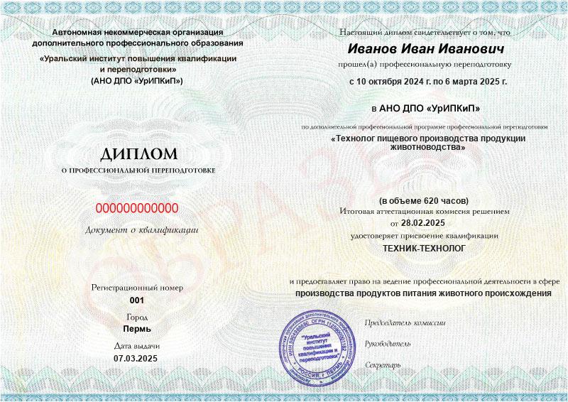 Технолог пищевого производства продукции животноводства (620ч)